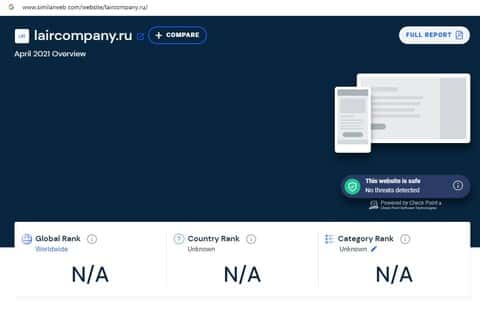 При проверке источников бренда по странам компании Lair Company на сайте similarweb com, информация отсутствует, что является признаком фальшивого лохотрона.