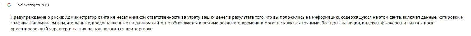 На сайте скам-конторы Live Investing Group отсутствует клиентское соглашение, здесь есть лишь информация о всевозможных рисках, что является признаком лохотрона.