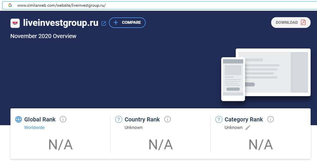 При проверке источников бренда по странам конторы Лайв Инвестинг на сайте similarweb com, информация отсутствует, что является признаком фейкового лохотрона.