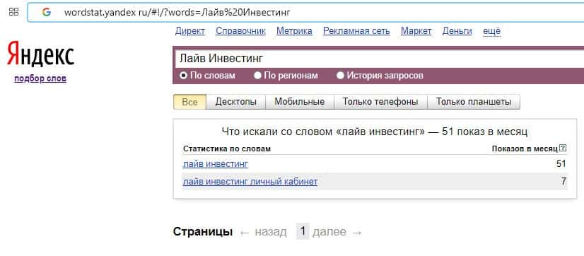 Количество брендовых запросов названия компании на русском языке "Лайв Инвестинг" на wordstat yandex ru составило 51 запрос за месяц.