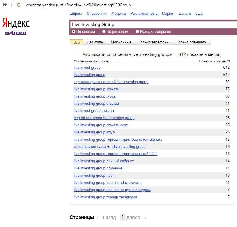 Данный интернет-лохотрон под названием "Live Investing Group" на Вордстарт Яндекс Ру скорее всего пользуется популярностью из-за рекламы в интернете.