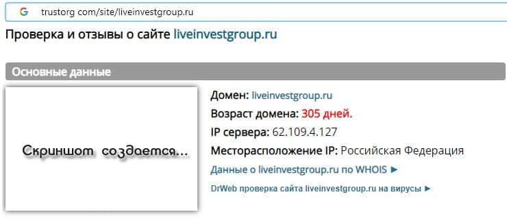 Проверка веб-сервиса шулеров Live Investing Group на trustorg com показала, что возраст домена к моменту написания статьи составляет 305 дней, скорее всего домен купленный.