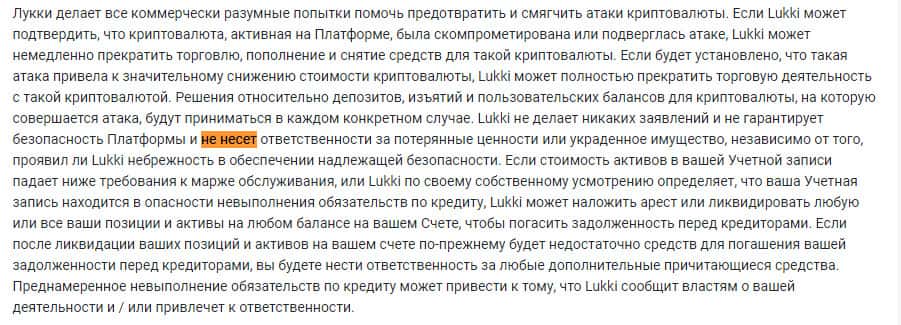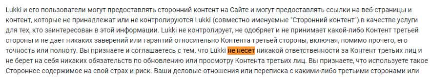 Также жулики Lukki io решили себя дополнительно обезопасить и указали, что не несут ответственности за контент третьих лиц. Чего и следовало ожидать.