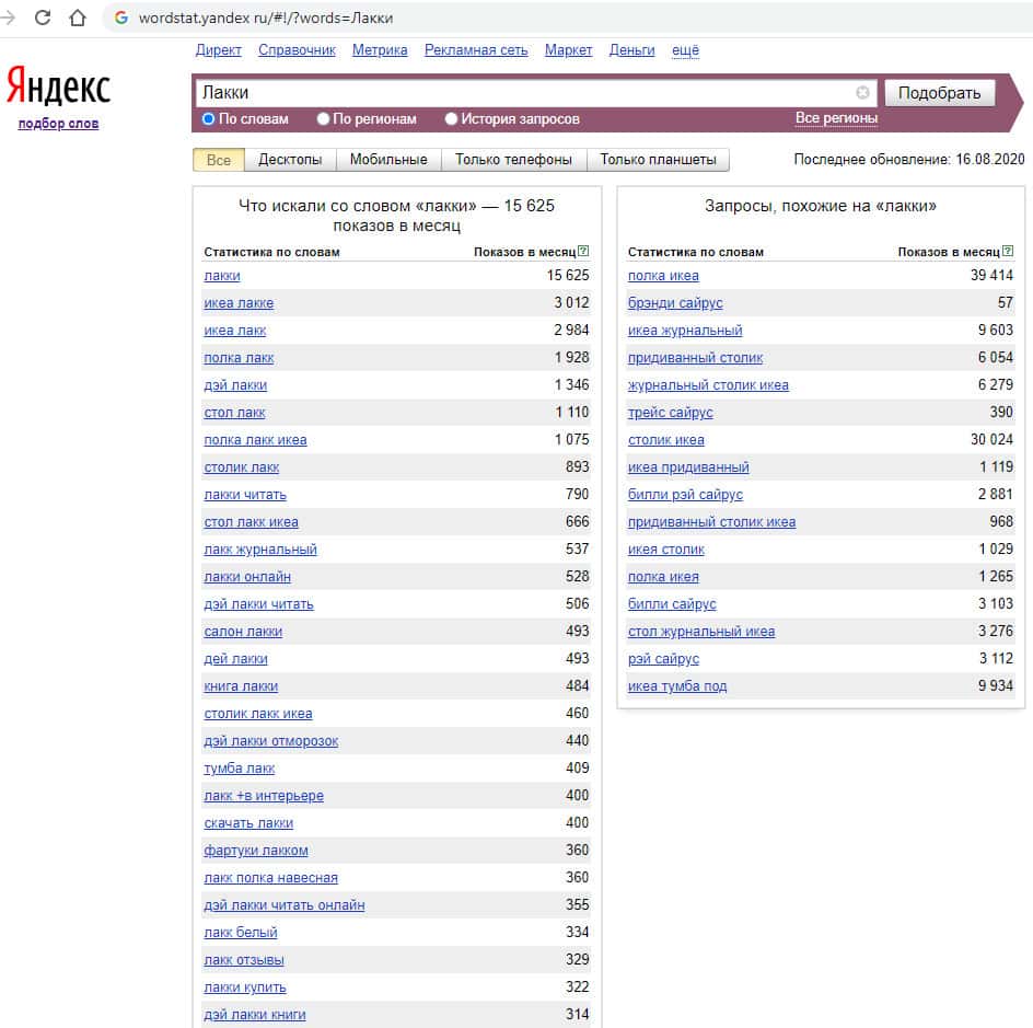 После запросов на английском языке, переходим к показам на русском. И тут мы видим совсем другую картину. По запросу "Лакки" показывает 15 625 показов в месяц.