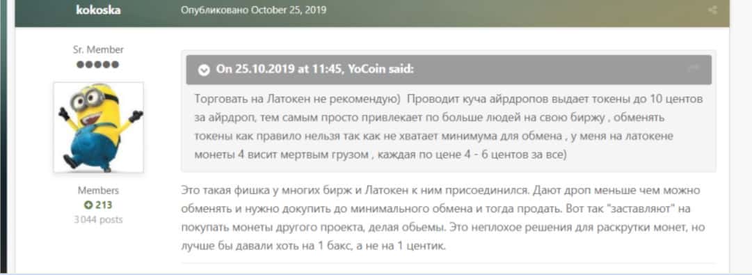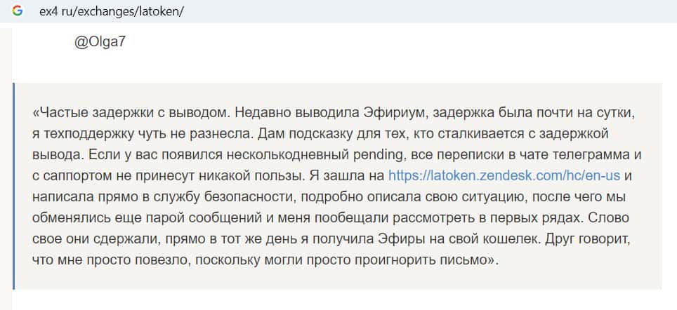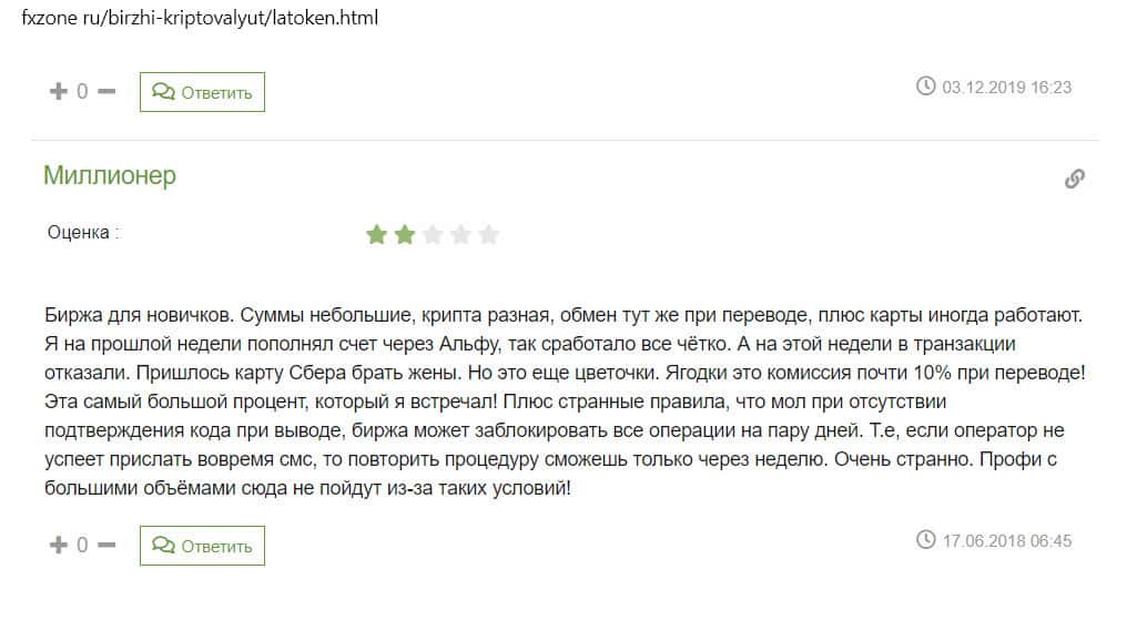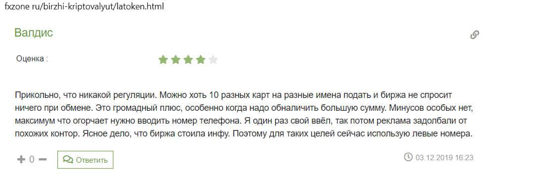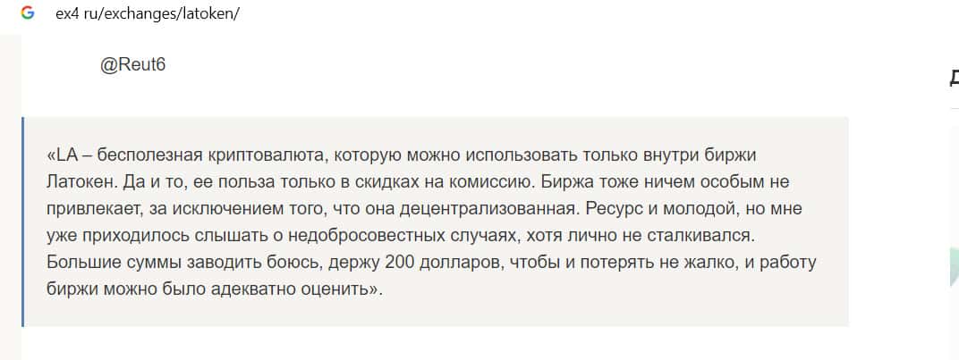 Из комментария на сайте ex4 ru стало понятно, что пользователи не очень-то ценят внутреннюю криптовалюту биржи Латокен. По их мнению, он абсолютно бесполезна, так как больше нигде не торгуется. Еще человек написал, что боится заводить на площадке большие суммы, так как есть риск потерять их.