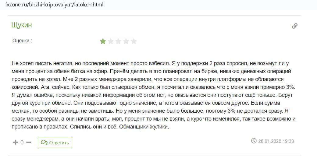 Трейдер написал на сайт fxzone ru негативный комментарий о работе биржи Латокен. Менеджеры уверяли его, что операции внутри платформы не облагаются комиссией, после чего взяли с него повышенный процент. Когда мужчина стал задавать вопросы, сотрудники прикрылись правилами клиентского соглашения.