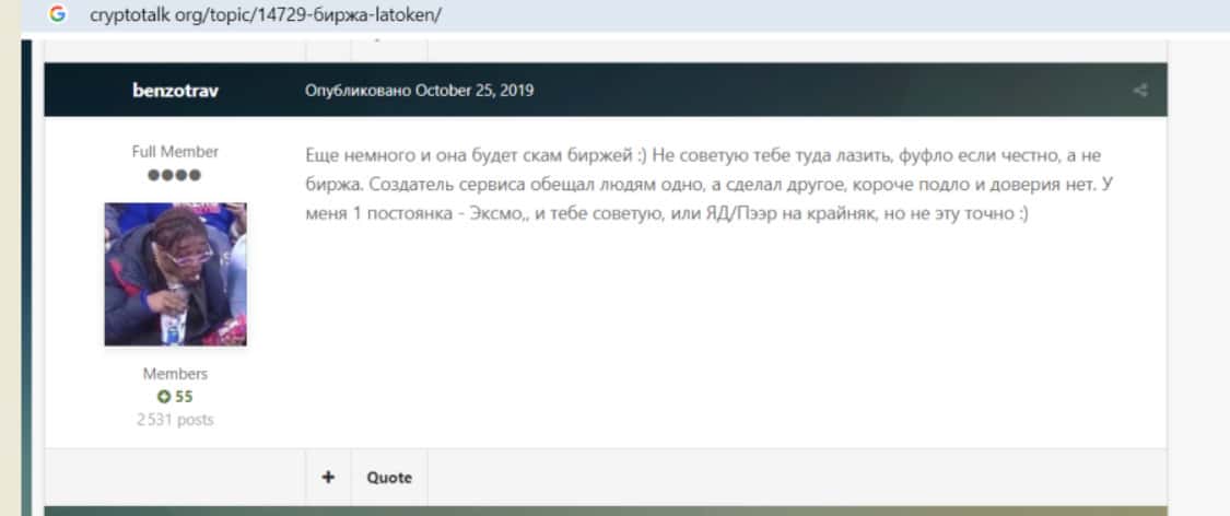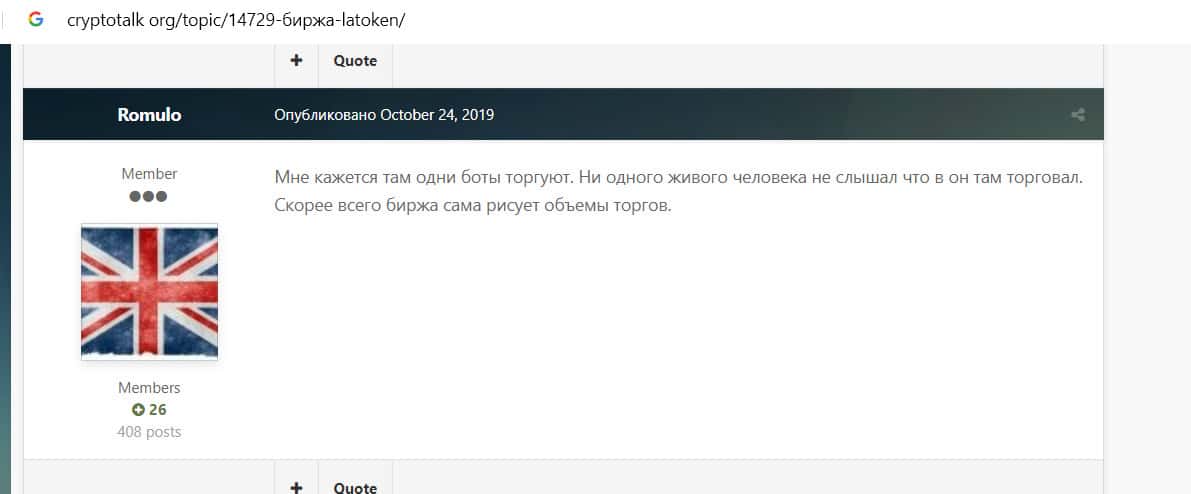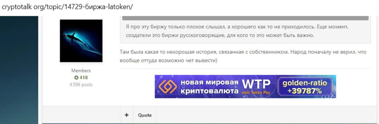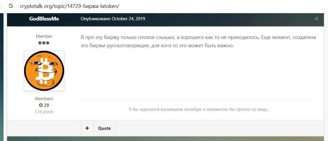 - На вопрос пользователя о проекте Латокен на форуме cryptotalk org появилось множество комментариев негативного характера