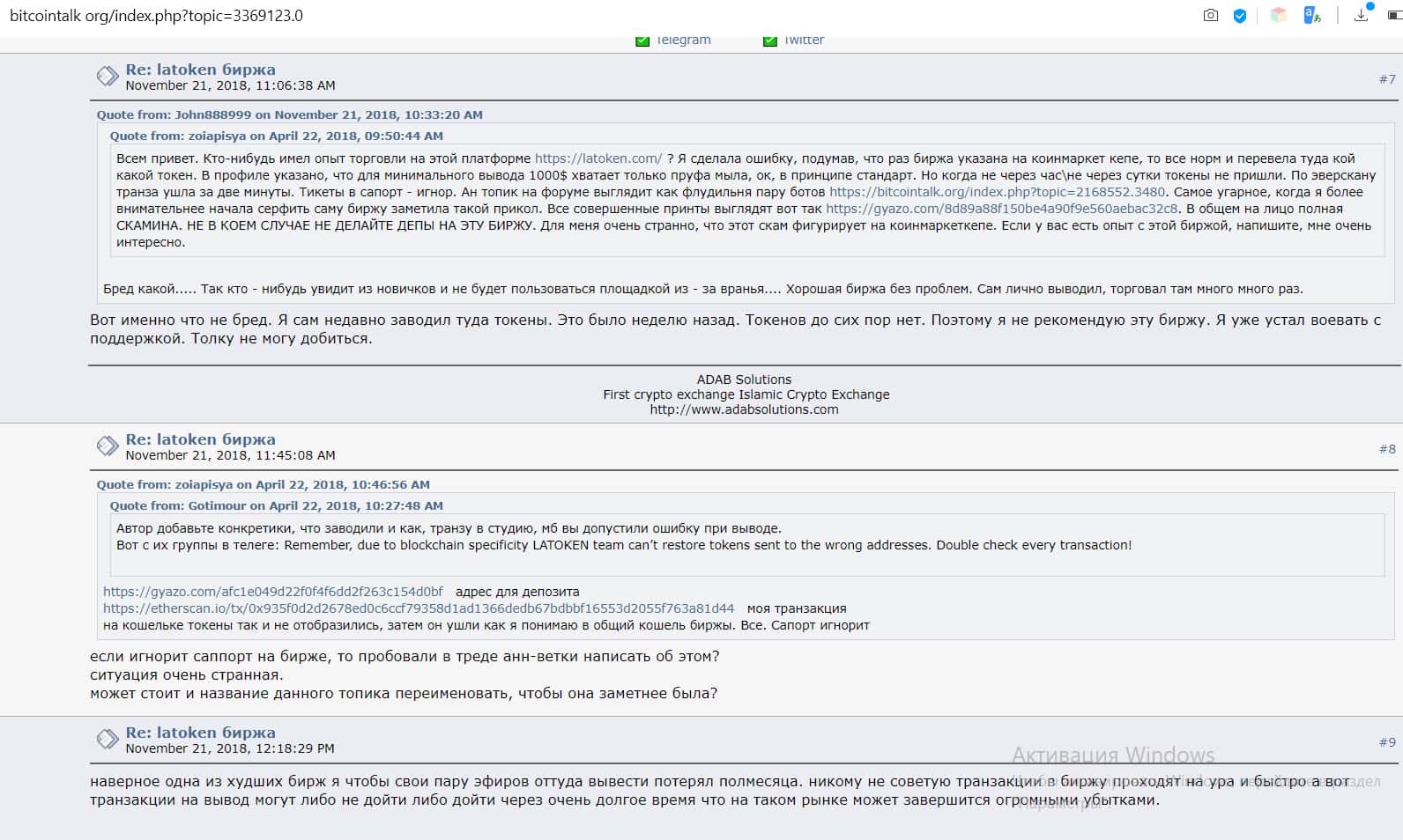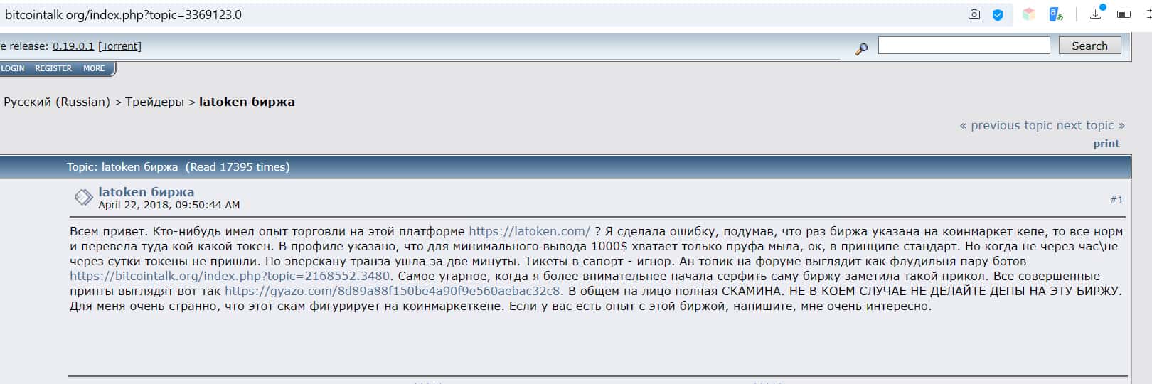 Сообщение трейдера на сайте bitcointalk org: налицо явный скам, ни в коем случае не заводите депозит на Латокен!