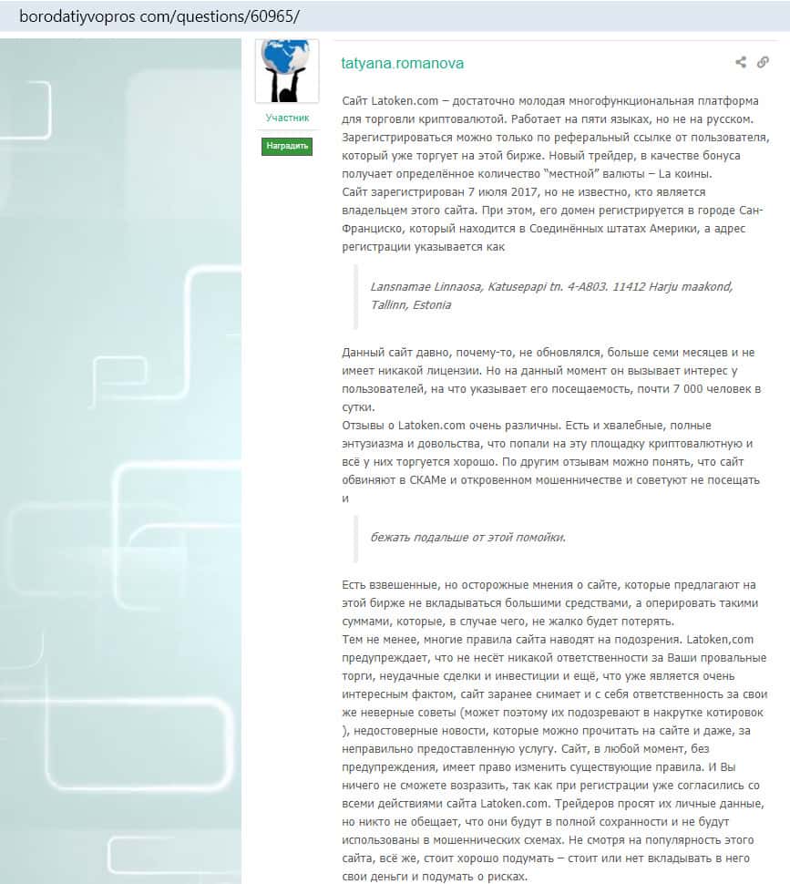 Отзыв-обзор о компании Латокен на сайте borodatiyvopros com: много подозрительных признаков мошеннического проекта