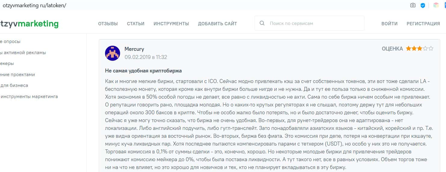 - Отзыв на сайте otzyvmarketing ru: биржа Латокен неудобная, от собственного токена нет пользы, большой депозит заводить страшно