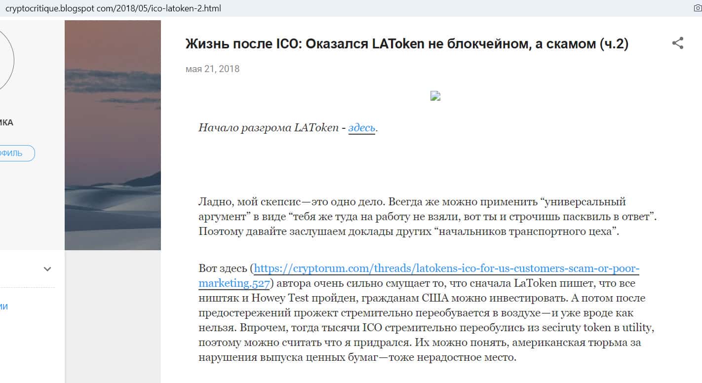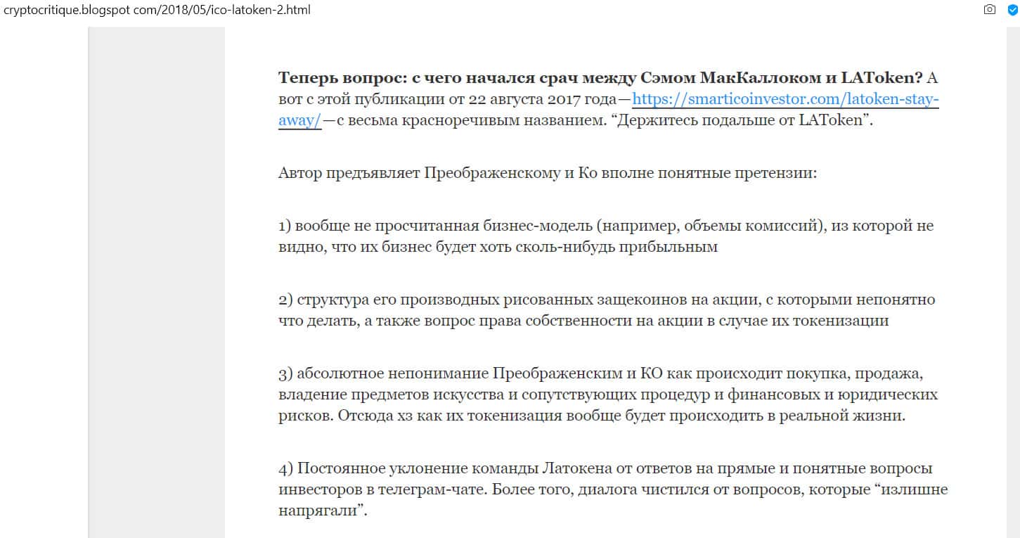 На сайте cryptocritique.blogspot com блогер опубликовал подробный разбор того, почему он считает биржу Латокен не блокчейн-проектом, как они сами себя называют, а банальным скамом. Автор опирается на статьи из интернета об этой компании и интервью с сотрудниками биржи.
