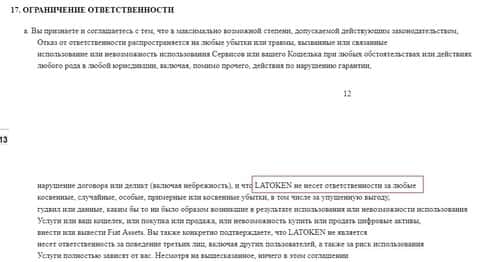 В 17том разделе своих условий использования мошенники Latoken вообще сливаются по отношению к своим обязательствам и не несут ответственность по отношению к неправильности предоставления услуг, или неточности своих услуг. Не несут жулики Латокен и ответственности за случаи помех и вмешательства с их стороны.