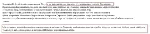 Начинается политика конфиденциальности криптолохотрона Latoken со стандартных условий о том, что вы соглашаетесь с ней фактом использования сайта, а так же мошенники Латокен могут по своему смотрению вносить правки в текущую политику в любое время и без вашего согласия.
