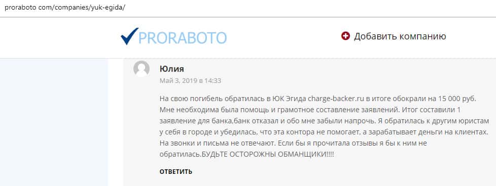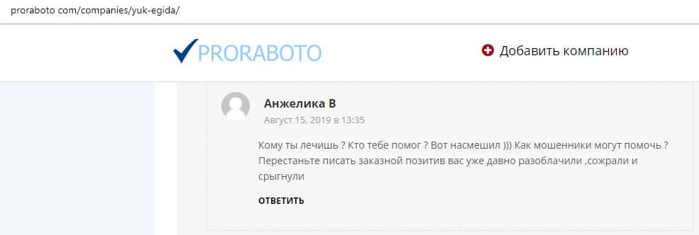 Жалоба на контору Эгида от очередного обманутого пользователя сети Интернет