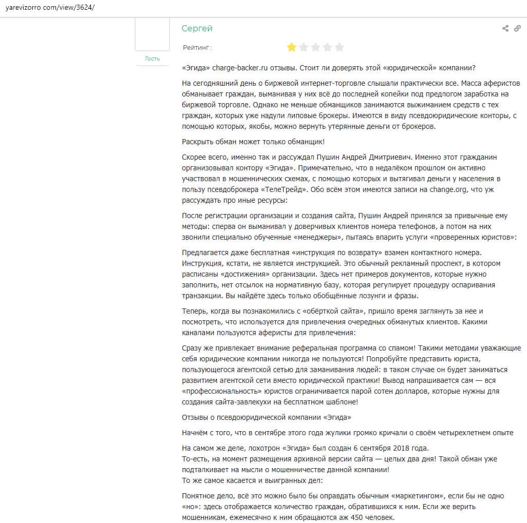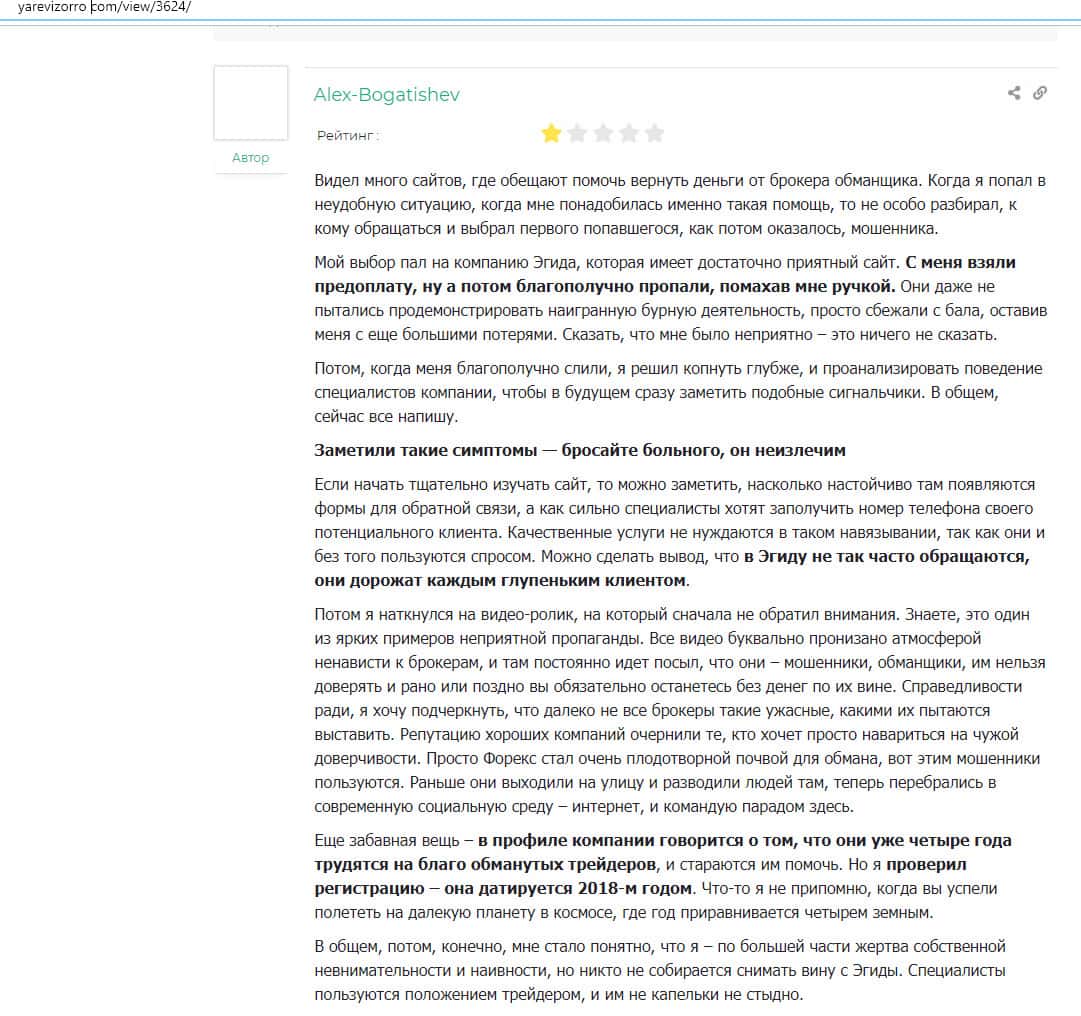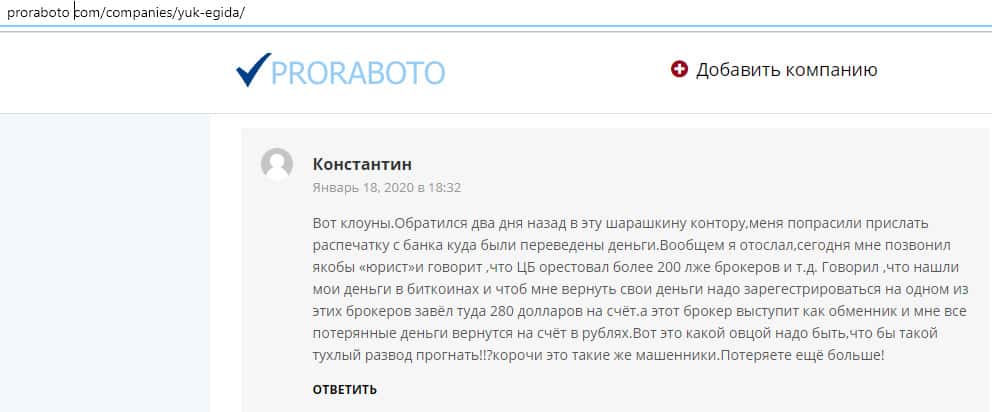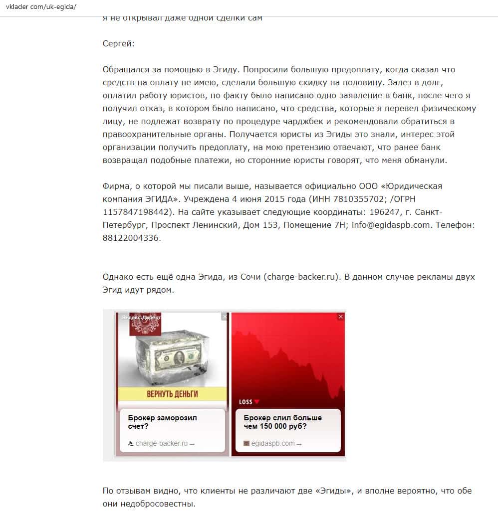 Ниже представлен еще один отзыв, в котором мошенническая организация псевдо ЭГИДА обворовала клиента. Человек рассказал, как лохотрон крадет деньги в открытую, так как не получил тот гарантированный результат, который обещали. Получается брокер обманул, а эти псевдо-помощники кинули!