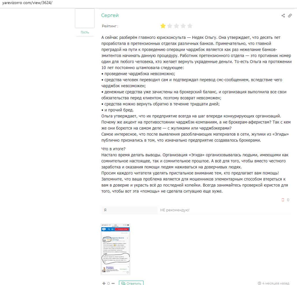 Человек решил высказать свое мнение, касательно того, что в интернете очень много различных контор, которые занимаются возвратом средств, но далеко не все являются честными и открытыми. И конечно же это не про контору псевдо ЭГИДА, которая занимается откровенным разводом своих клиентов.