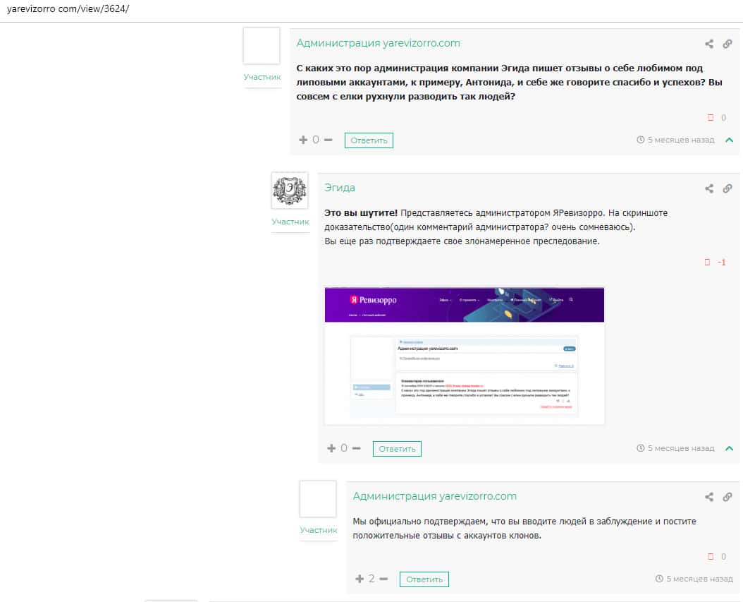 Далее представлена переписка администрация сайта yrevizorro com с представителем мошеннической организации псевдо ЭГИДА. Он указывает, что очень странно видеть, как сама шарашкина контора использовала подставные аккаунты и написала положительные отзывы. Таким образом лохотрон накручивает себе липовую репутацию.