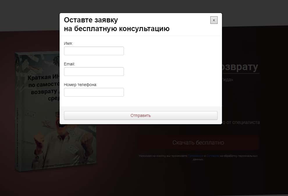Далее представлен скриншот формы заявки на бесплатную консультацию LawaEgis Com, которая используется как ловушка практически на каждом блоке первой страницы сайта. Следует сто раз подумать перед тем, как вписывать туда сове имя, электронную почту и номер телефона, иначе потом жулики потом от вас не слезут.