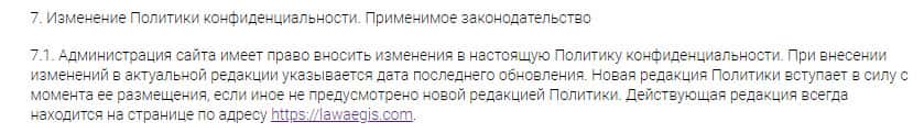 Также в политике конфиденциальности указано, что лохотрон LawaEgis Com в любой момент может изменить текст документа и соответственно, подписав его ранее, вы также должны согласиться с его изменением. А там, сами понимаете, написать можно все что угодно. Поэтому не стоит доверять этим ворам.