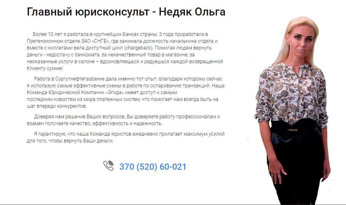 Мошенническая компания псевдо ЭГИДА является довольно открытой в плане информации о себе, так как чувствует безнаказанность за свои преступления. Вот с сайта мы узнаем, что главным юрисконсультом выступает некая Недяк Ольга. И связаться с ней можно по следующему номеру телефона: