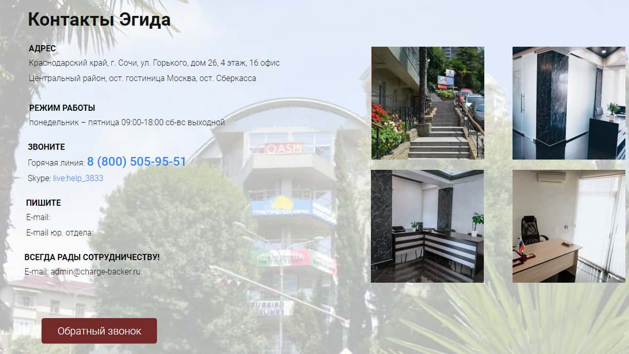 Поискав информацию о конторе LawaEgis Com в интернете, мы наткнулись на сайт, еще один похожий сайт, при чем он практически одинаковый. Изменяются только номера телефонов и в кое-каких местах адрес с прописки в Сочи (charge-backer ru) на прописку в Санкт-Петербурге (lawaegis com). Так что будьте осторожны, чтобы не попасться в лапы к этим жульбанам.