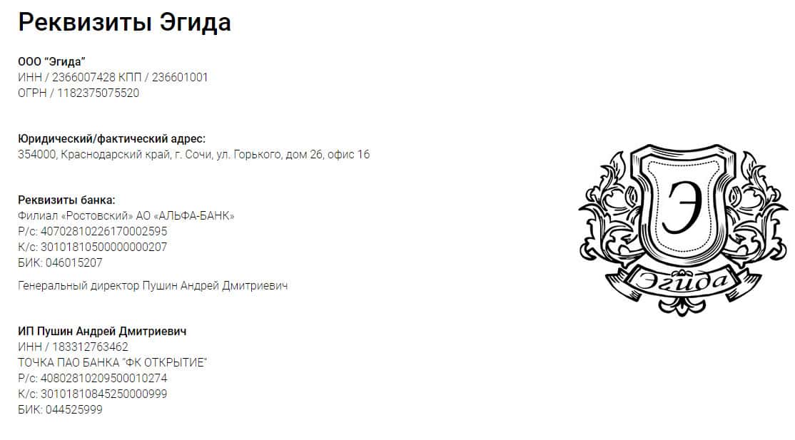 - ООО "Эгида" - ИНН / 2366007428, КПП / 236601001, ОГРН / 1182375075520;