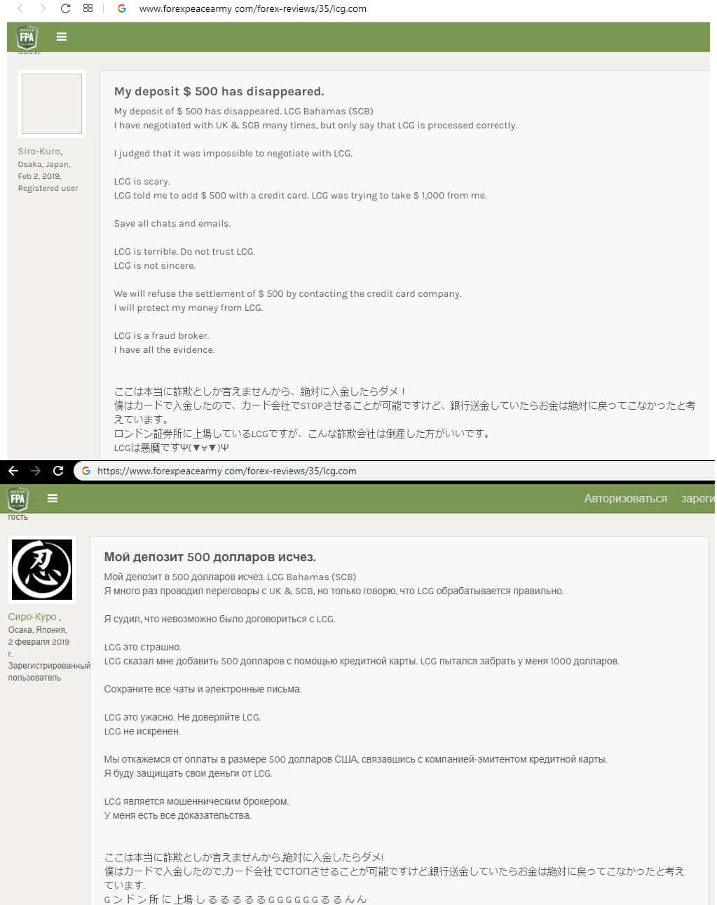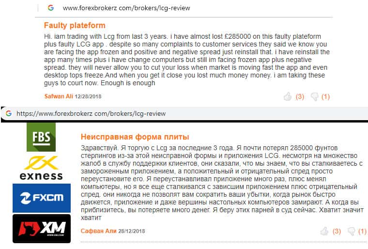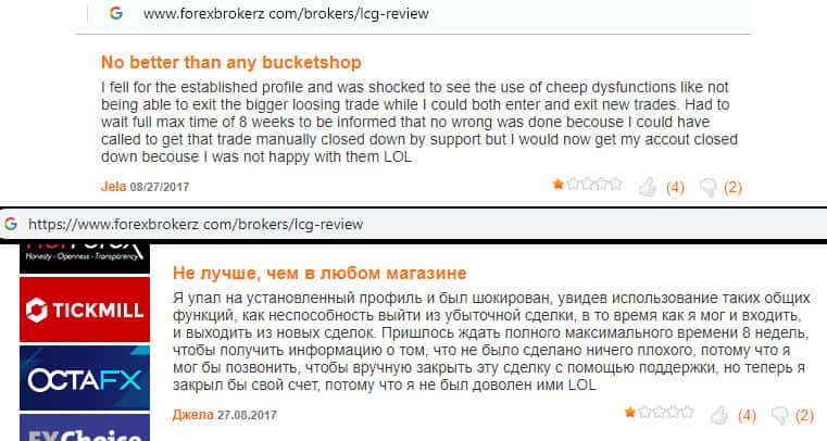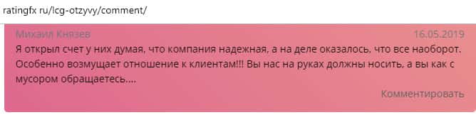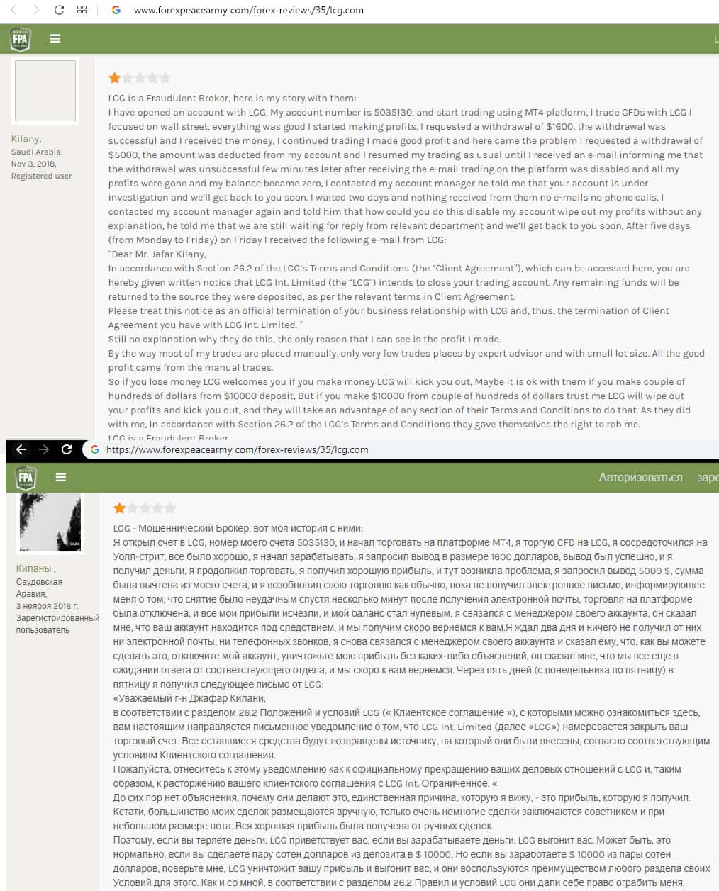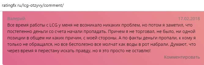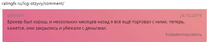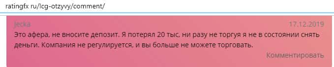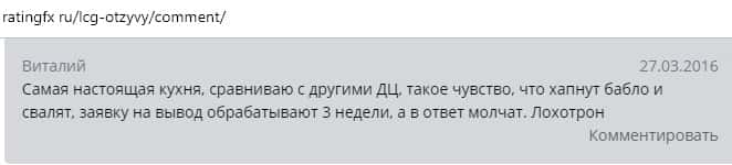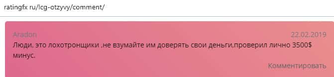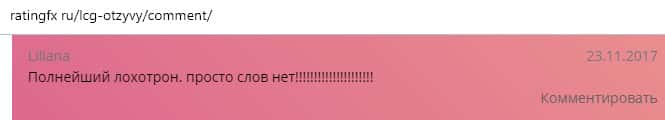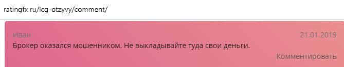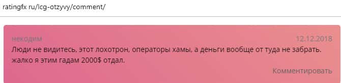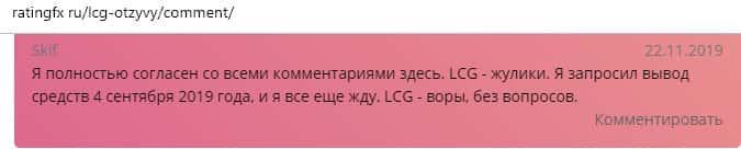По словам пользователя сети, в конторе LCG работают ушлые мошенники, поэтому лохотрон является ненадежным в возврате денег и можно на это даже не надеяться. Следует подальше держаться от этой шулерской организации. Также есть мнение, что счета тупо сливаются спредами.