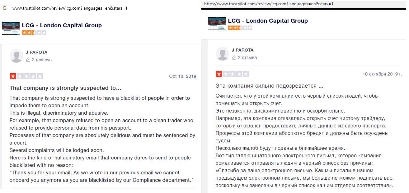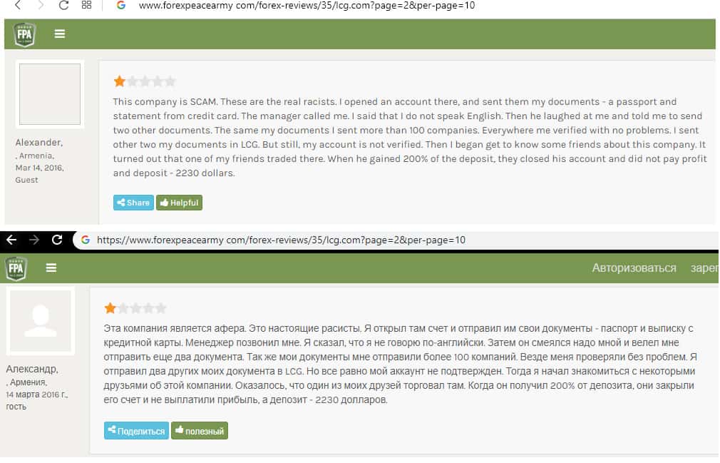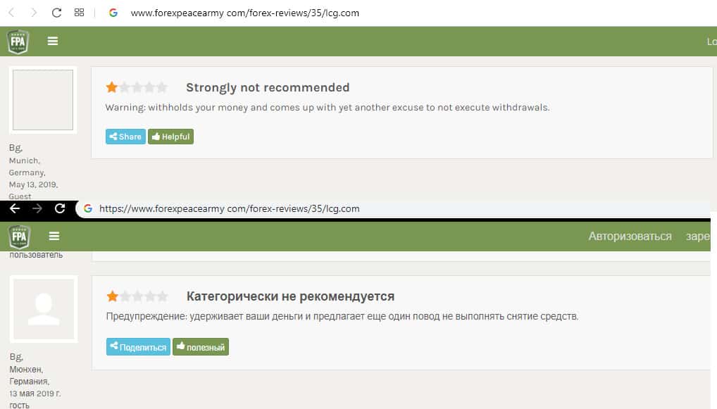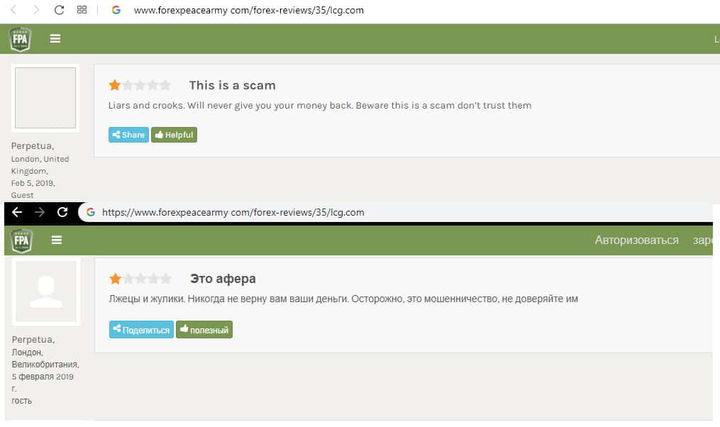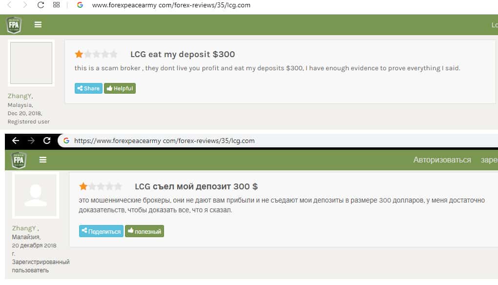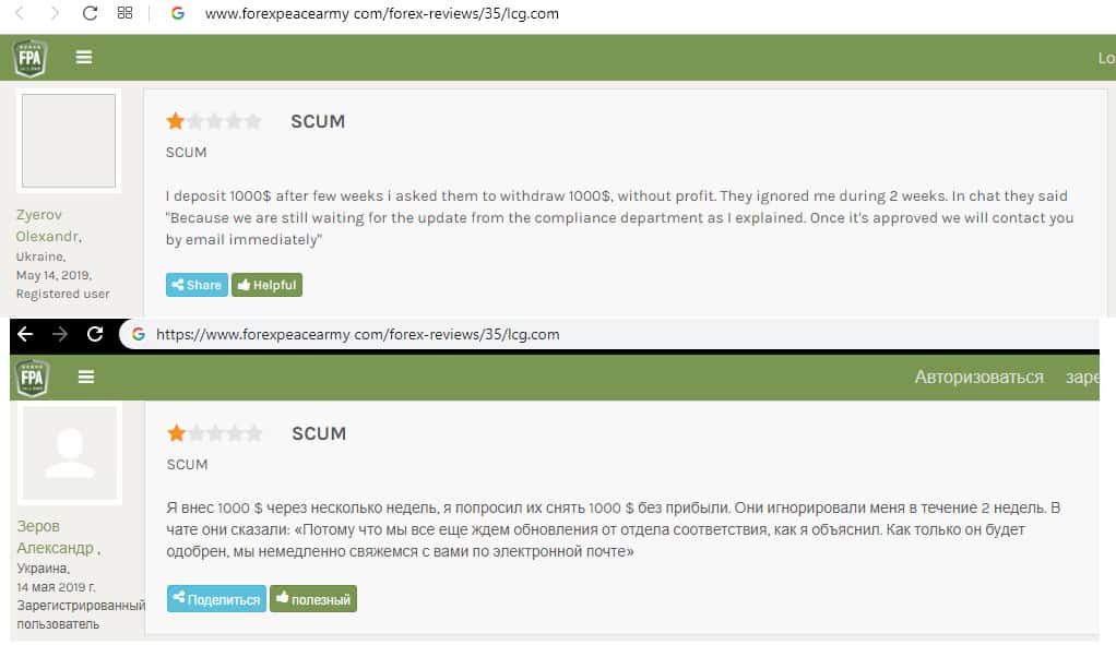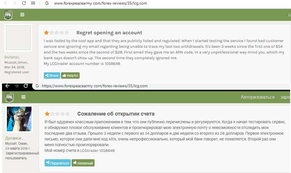 По словам пользователя сети, в конторе LCG работают ушлые мошенники, поэтому лохотрон является ненадежным в возврате денег и можно на это даже не надеяться. Следует подальше держаться от этой шулерской организации. Также есть мнение, что счета тупо сливаются спредами.