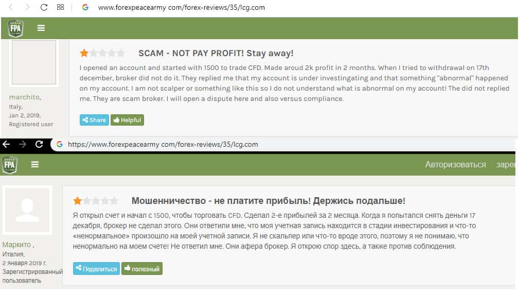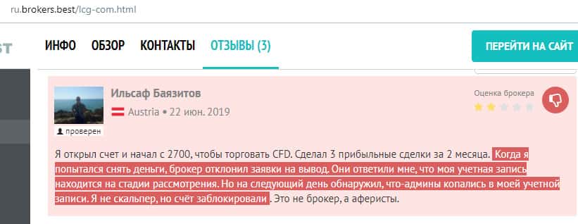 Далее представлен отзыв, в котором мошенники оффшорного брокера LCG обокрали клиента на деньги. Человек сделал депозит, а, после того как заработал немного прибыли, решил вывести часть. Брокер поступил очень мерзко и забрал всю прибыль жертвы, заблокировав ему доступ к аккаунту.