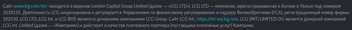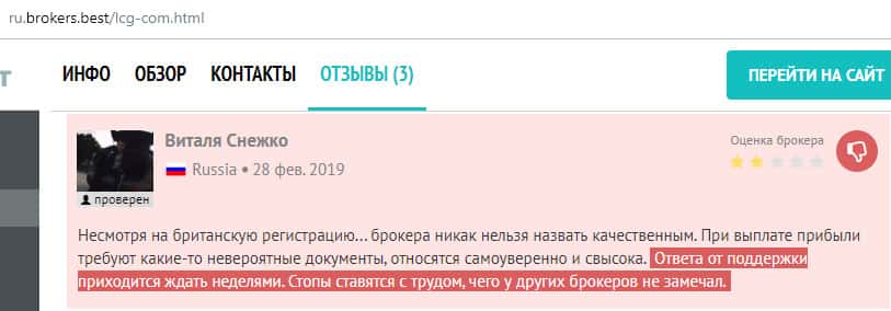 По словам автора следующего отзыва, компания-владелец LCG действительно зарегистрирована то ли в Лондоне, то ли на Багамских островах. Также есть момент с регуляцией деятельности - она то у одного регулятора, то у другого. Самое главное, что платежные системы толком не налажены, а это очень опасно для клиентов.
