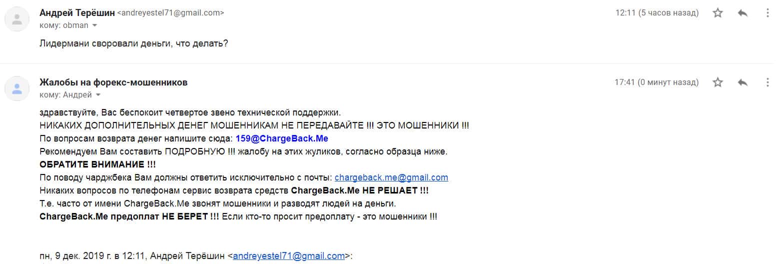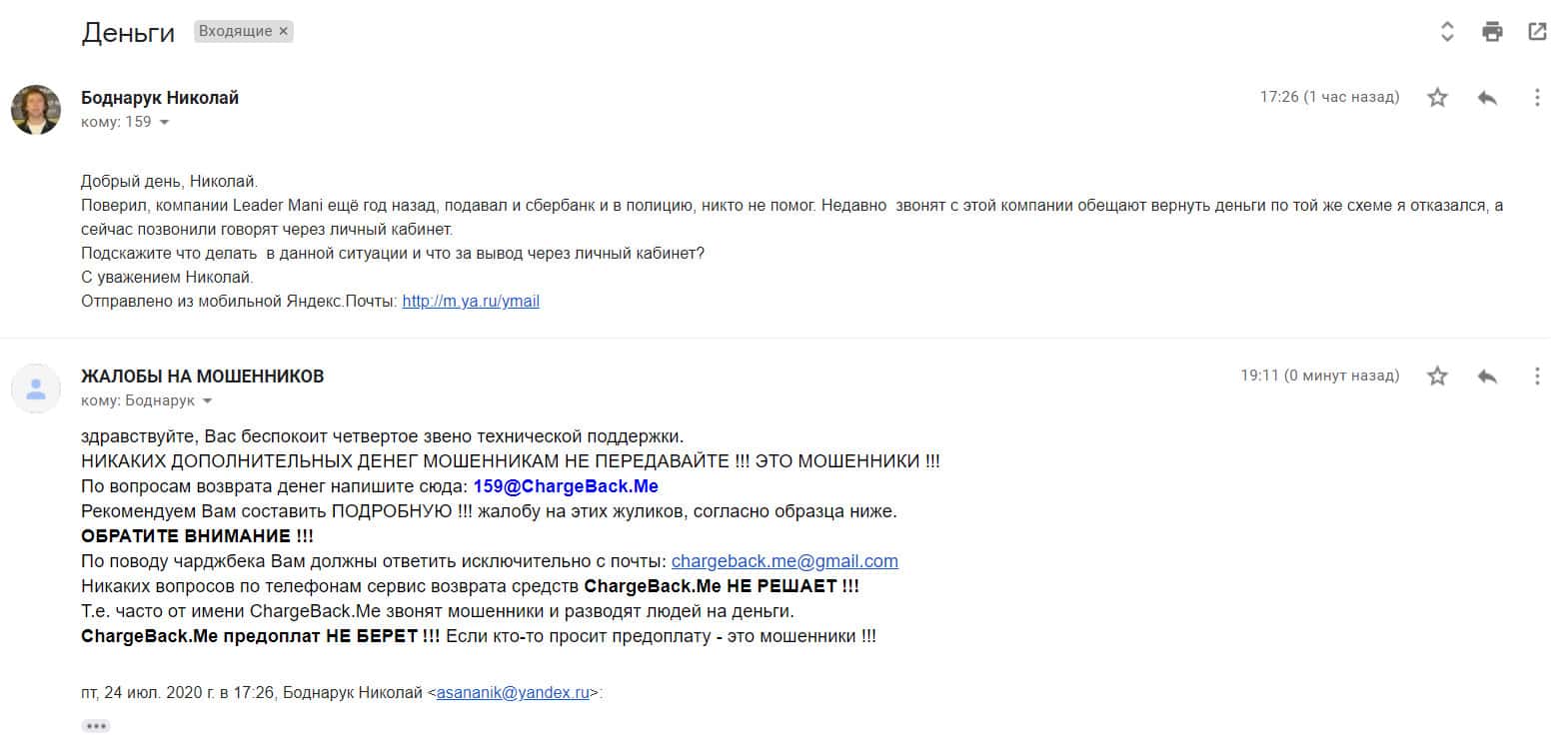 Если мошенники из Leader Money и Вас тоже слили, то в таком случае в обязательном порядке сообщите об этом нам. Оставьте Ваш адрес электронной почты в форме связи чуть ниже, с Вами установят контакт.