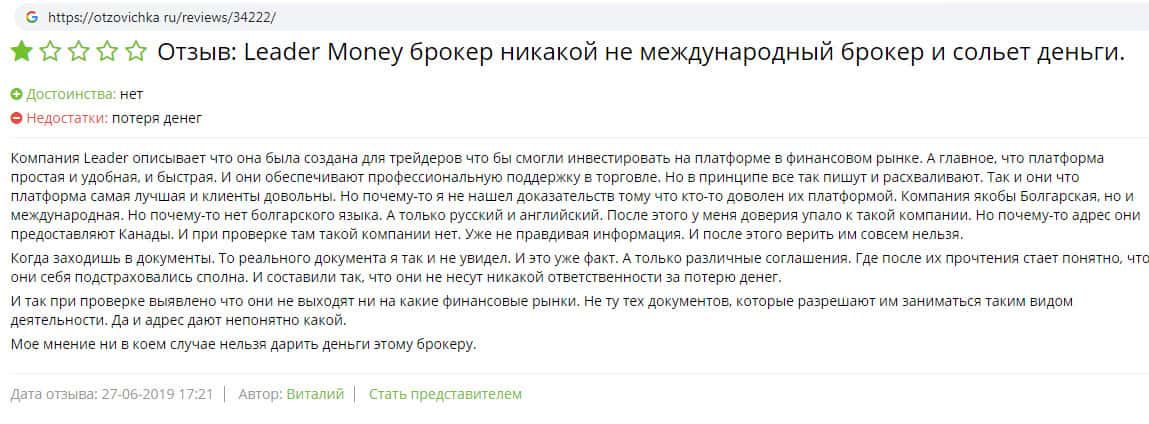 - Отзыв о скам-брокере Leader Money найден на сайте otzovichka ru