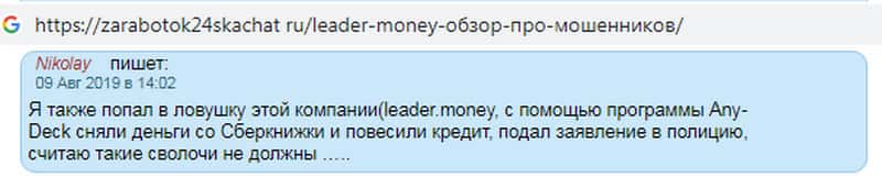 На сайте zarabotok24skachat ru под статьей указанной ранее, найден отзыв некого Nikolay, который пишет, что тоже успел попасть в ловушку компании Лидер Мани. У него сняли все денежные средства со сберкнижки и повесили на него кредит. Так часто поступают мошенники в подобных скам-конторах.
