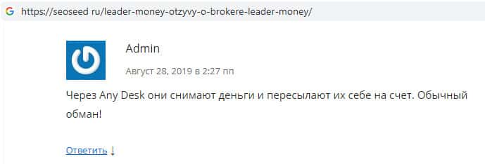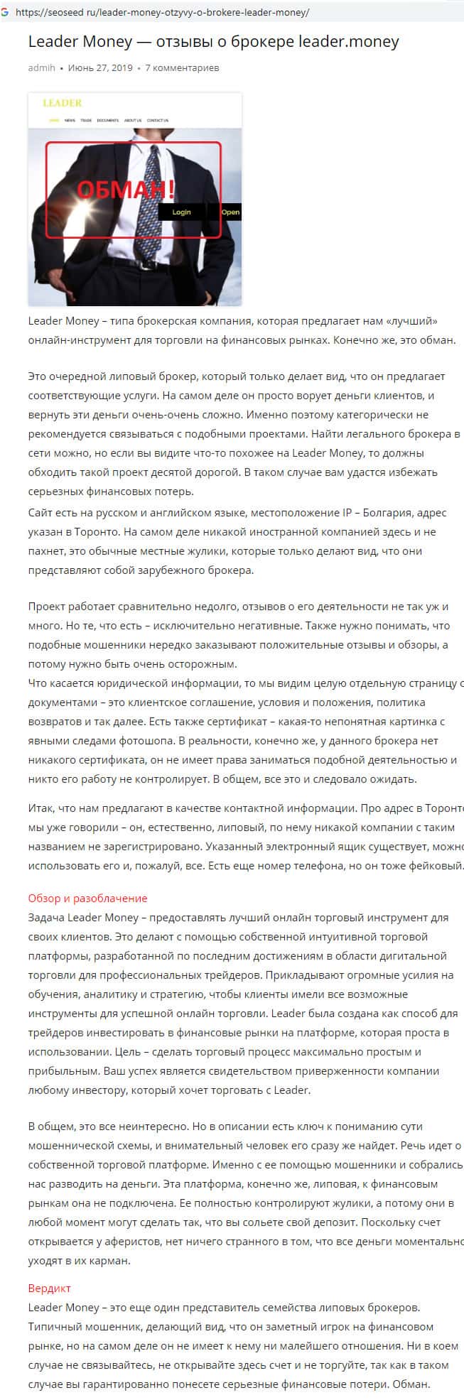 - Коммент пользователя Admin о скам-брокере Leader Money оставил на сайте seoseed ru