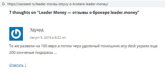 - Некий Эдуард пишет о махинациях брокера Leader Money на сайте seoseed ru