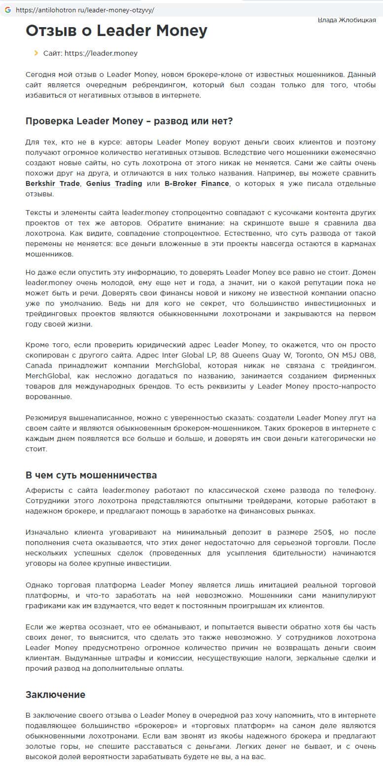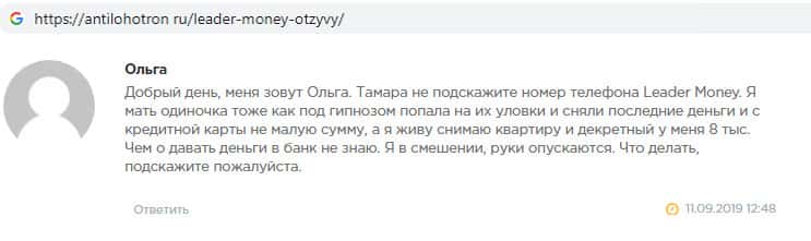 - Отзыв Ольги о скам-конторе Leader Money на веб-ресурсе antilohotron ru