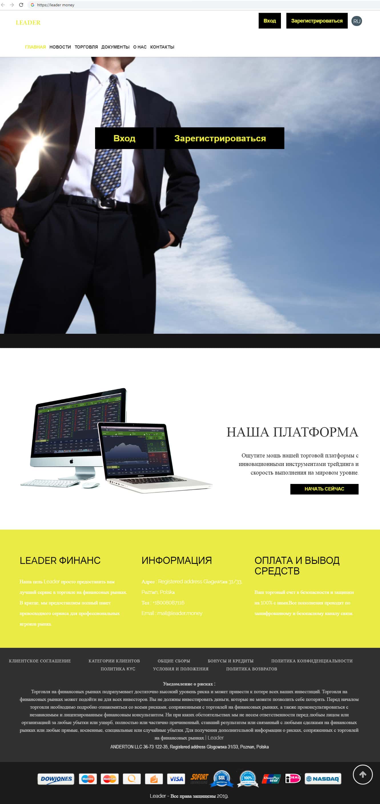 Leader Money - очередная скам-контора, ворующая денежные средства у своих клиентов. Данная брокерская организация обещает все наилучшие условия торговли на рынке форекс, после чего на самом деле вешая кредиты на своих клиентов. Не ведитесь на махинации и не верьте в обещания жуликов из Лидер Мани.