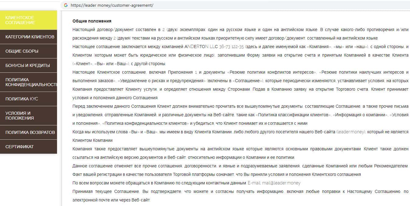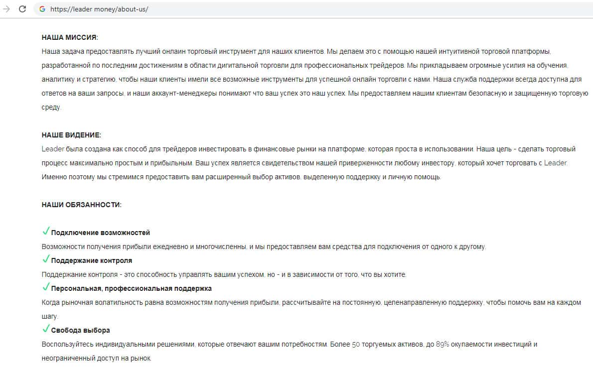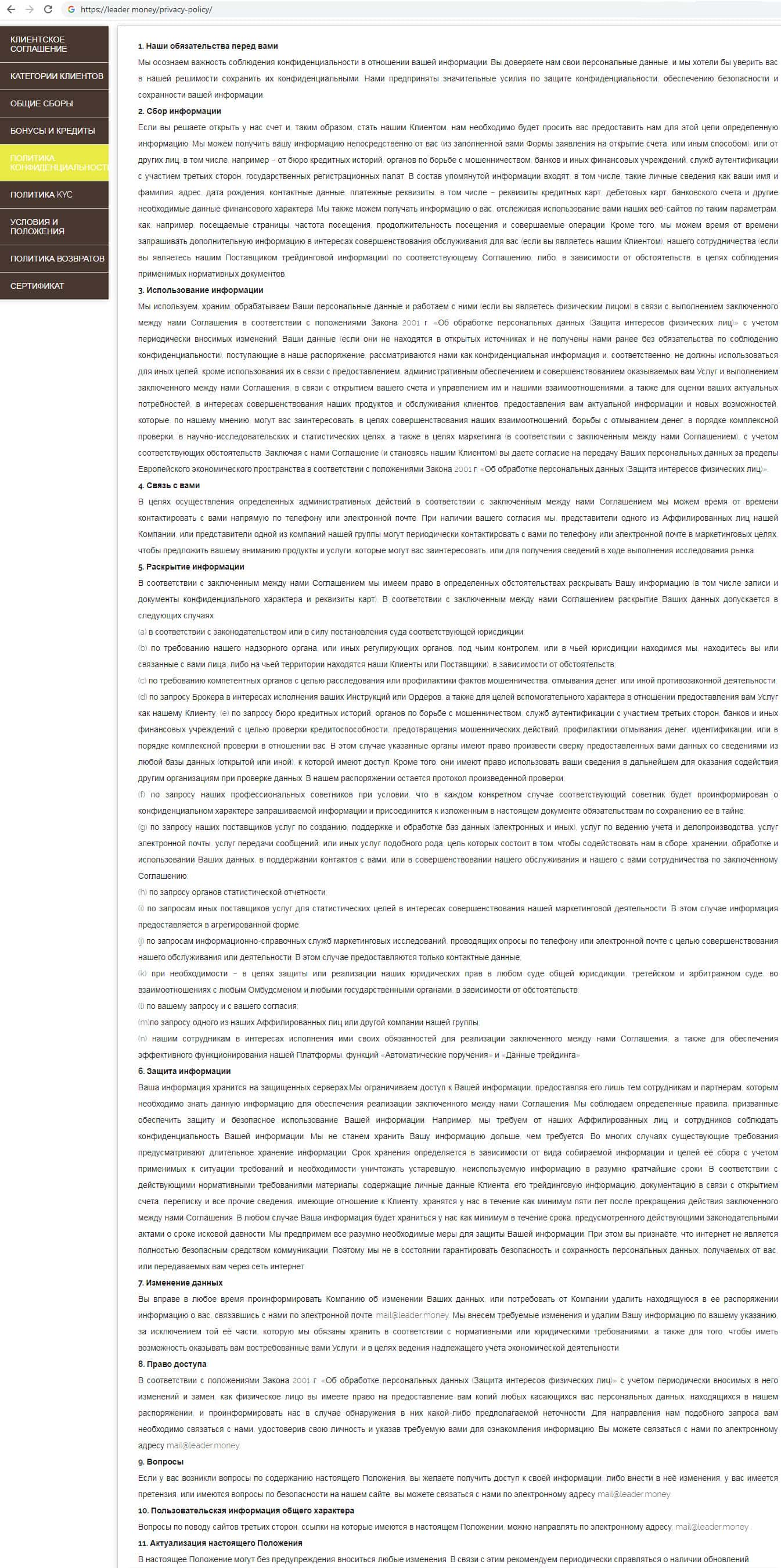 - Политика конфиденциальности на сайте мошенников Leader Money