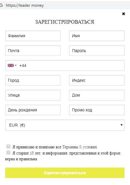 Чтобы увидеть саму торговую платформу скам-компании Лидер Мани необходимо зарегистрироваться. Зарегистрировавшись Вы тем самым отдаете свои личные данные мошенникам, которые могут передавать Ваши личные данные другим скам-брокерам.