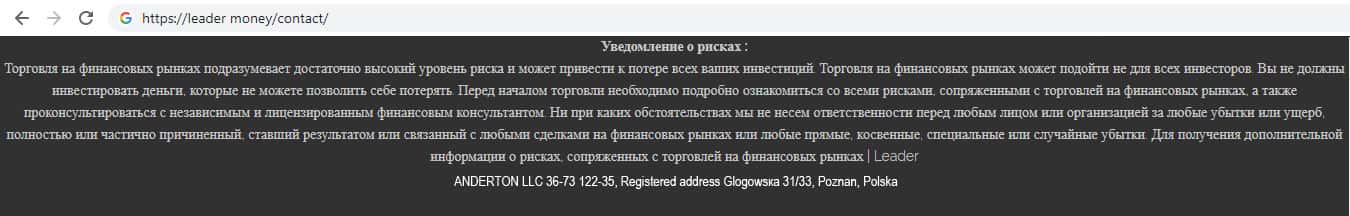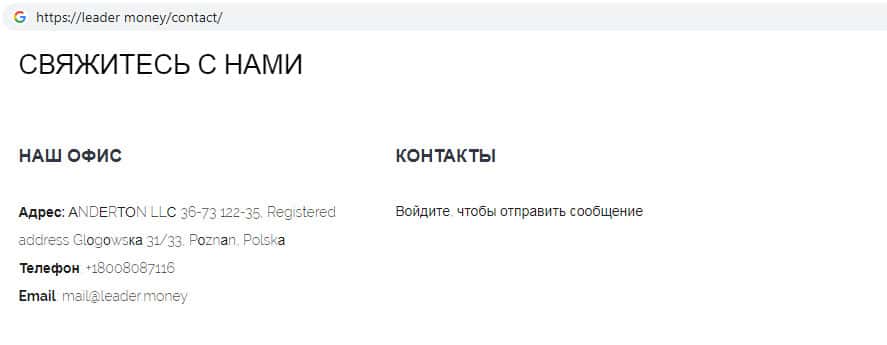 Юридический адрес компании Лидер Мани городе Познань на западе Польши, но прошу заметить, что на польском языке на сайте шуллеров не написано ни слова. Основными контактами, которые предоставляет мошенническая организация Лидер Мани, является номер контактного телефона и адрес электронной почты, которые представлены ниже: