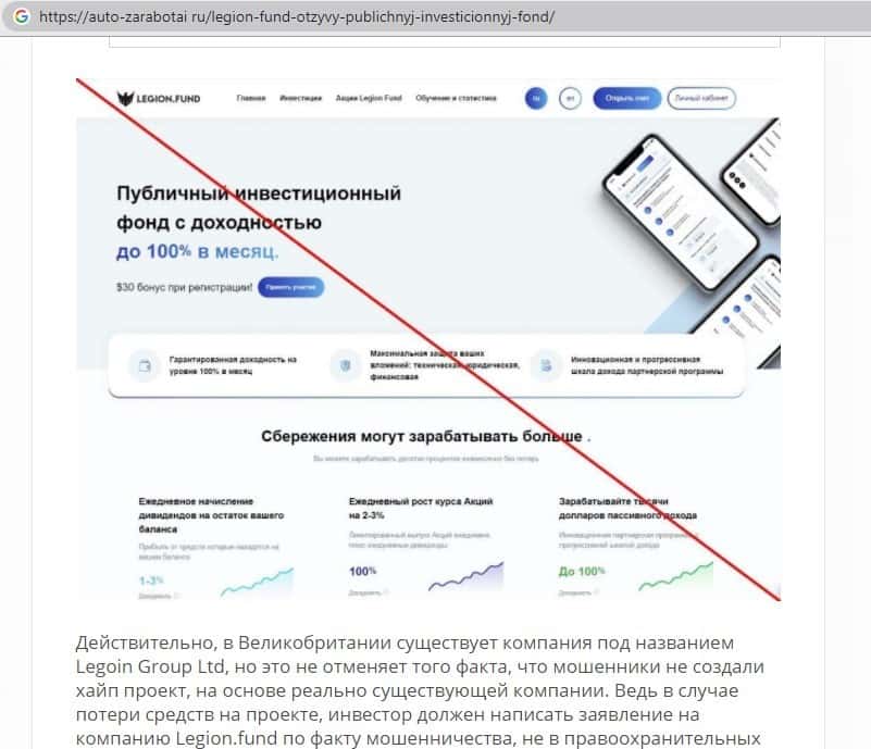 - Обзор основной страницы мошенников Легион Фонд