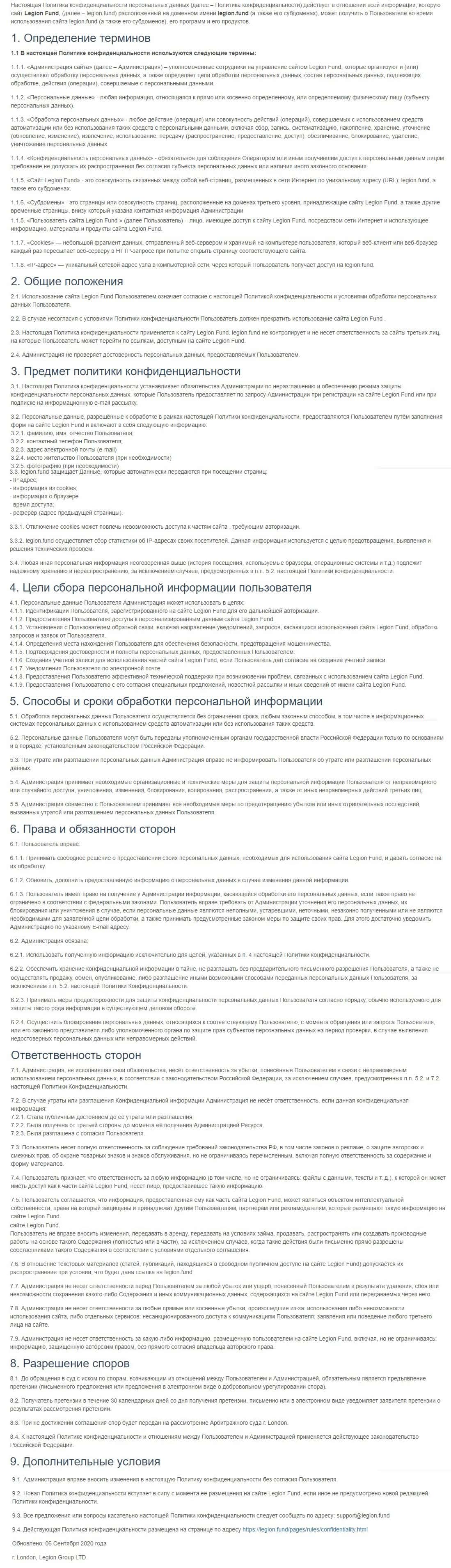- Пользовательское соглашение подвального сайта Legion Fund