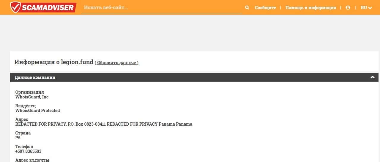 Информация с портала скамадвайзер о аферистах Legion Fund