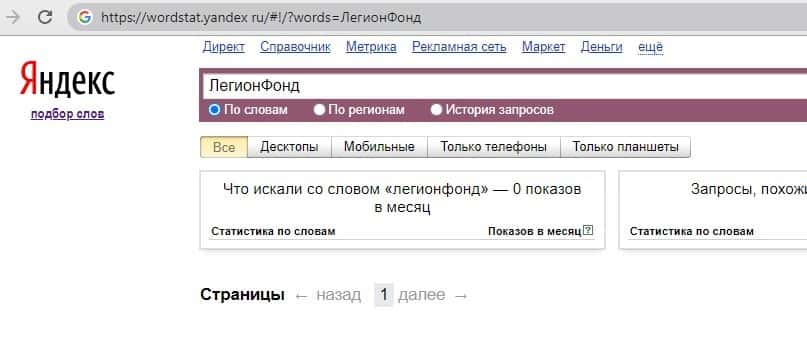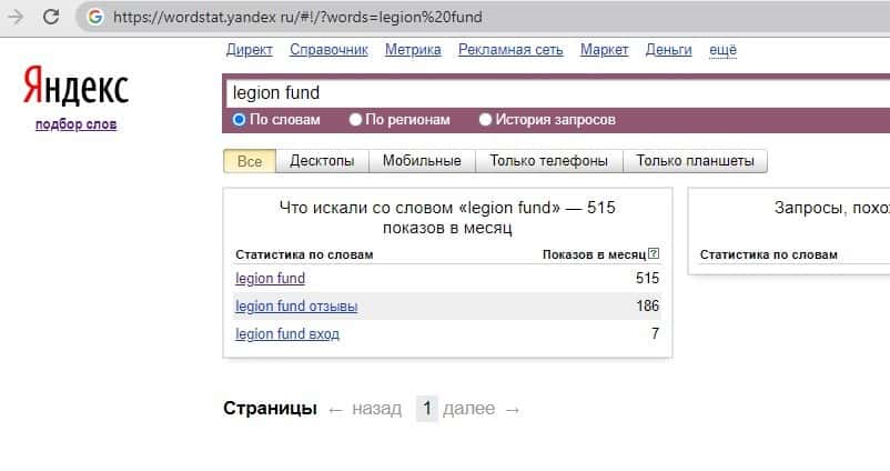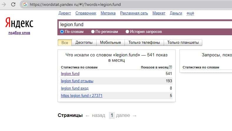 Нет смыла также искать запросы по бренду "Легион Фонд" так как данный запрос как и все пред ведущие показывает огромное недоверие среди клиентов и пользователей сетей.