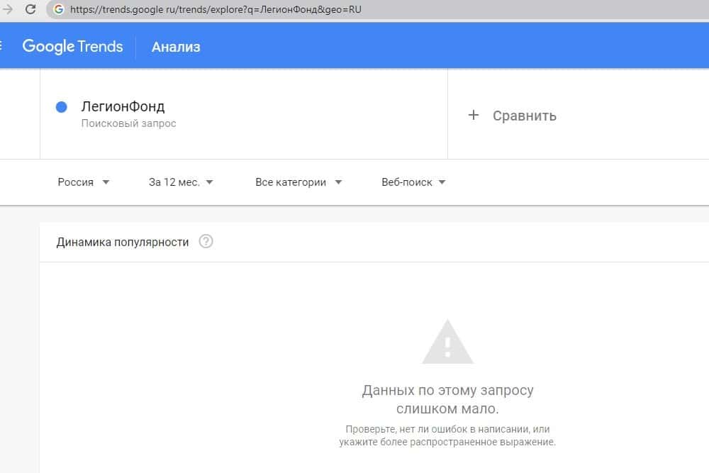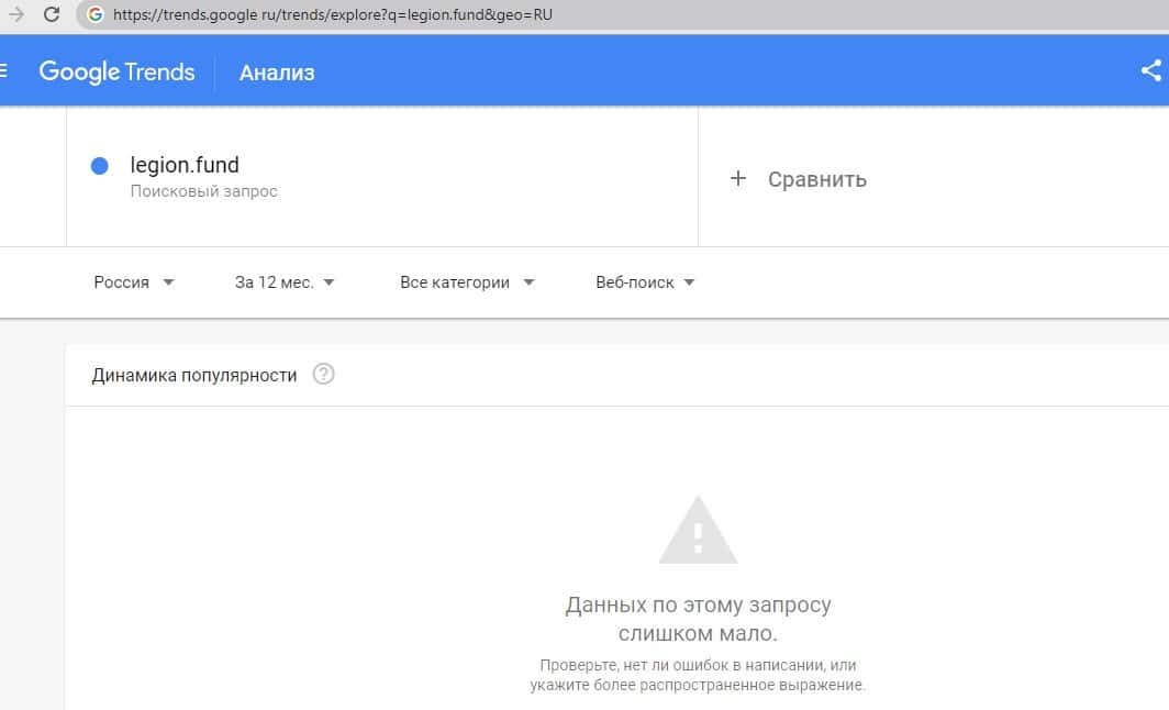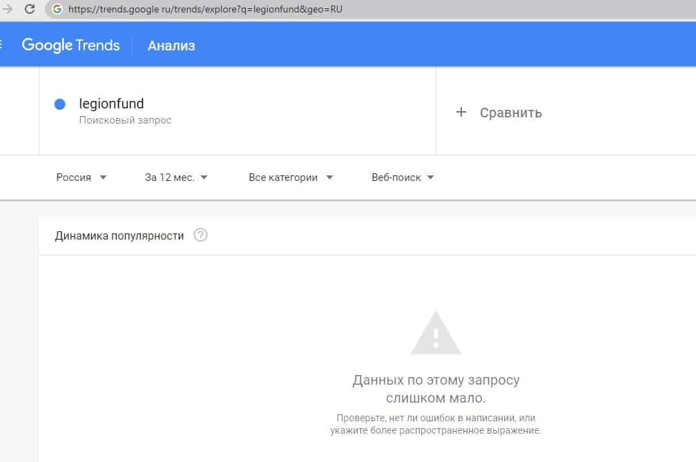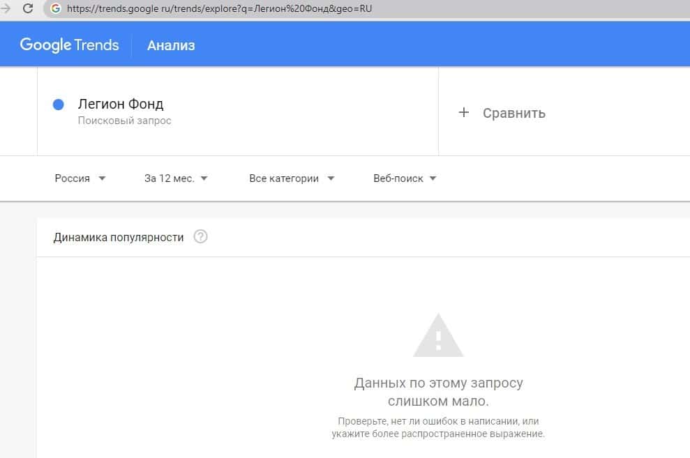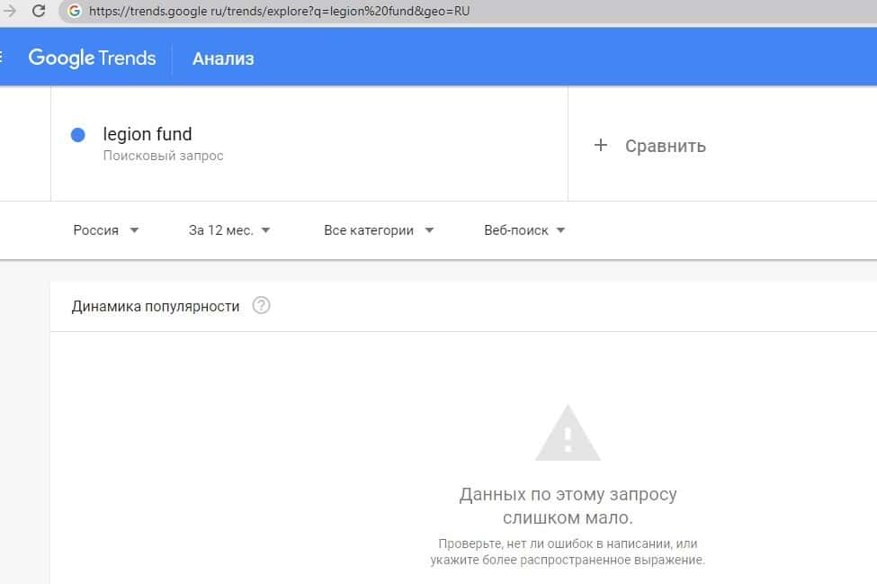 Данные по бренду "ЛегионФонд" на поисковом портале google com показал, что спросом данный бренд не пользуется и доверия среди посетителей к нему нет.