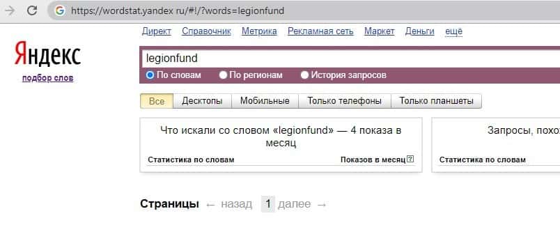 - Данные по количеству запросов бренда Legion Fund на портале яндекс
