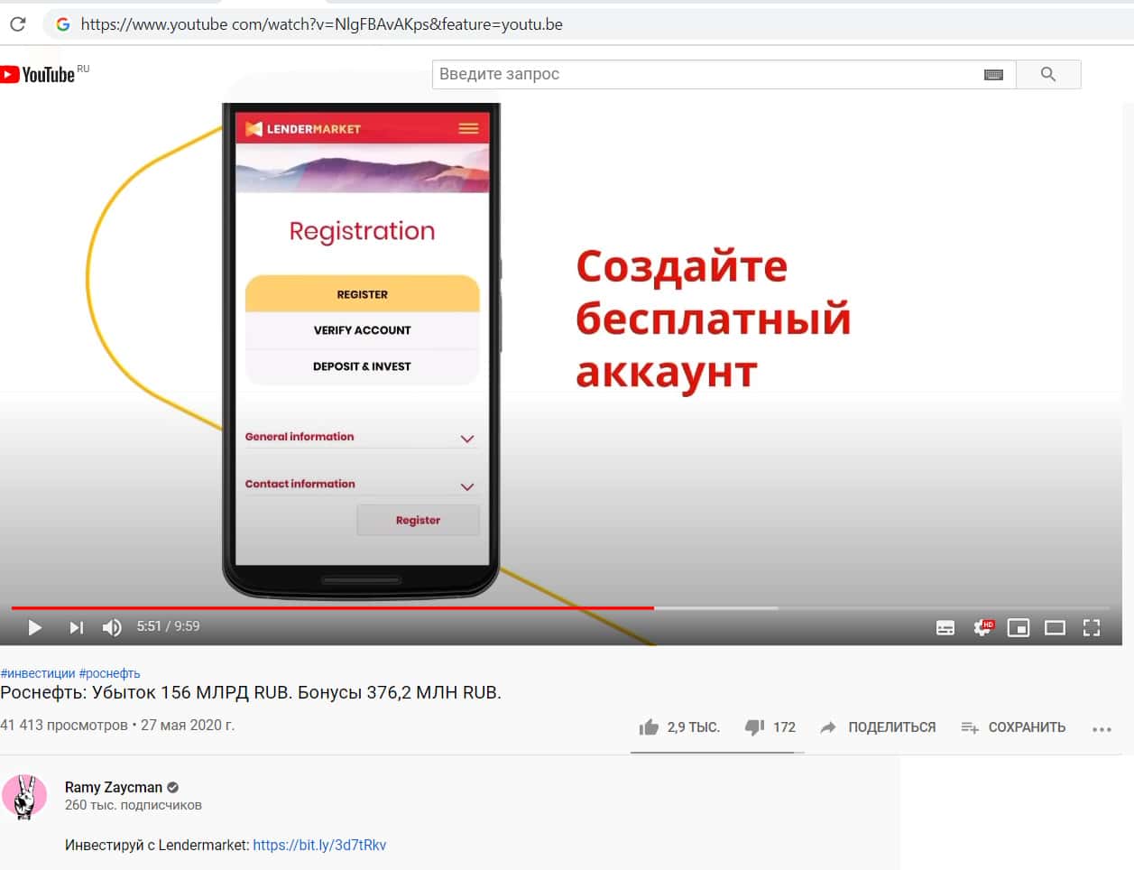 Достаточно популярный и вполне адекватный блогер-аналитик экономической направленности по непонятным причинам включил в свое экономическое видеообозрение блок рекламы сомнительной инвестиционной компании LenderMarket. Думается, здесь не обошлось без проплаченного заказа.