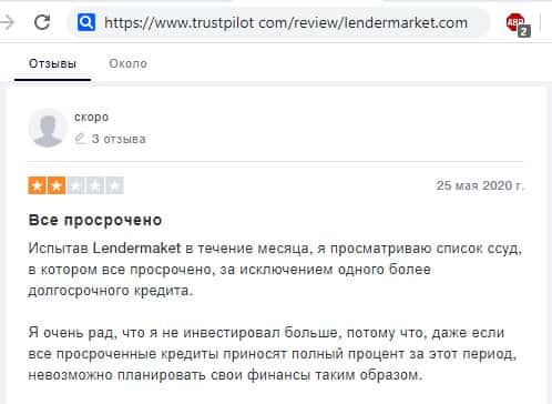Инвестор в своем отзыве на информационно-аналитическом веб-портале trustpilot com жалуется на инвестиционную платформу LenderMarket в связи с тем, что большинство ссуд, в которые он вложил свои деньги, оказались просрочены, и выражает удовлетворение тем, что он не поддался искушению инвестировать более крупные суммы.