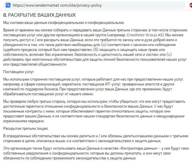 Согласно Политике конфиденциальности персональных данных, размещенной на официальном интернет-ресурсе инвестиционной компании LenderMarket Com, личная информация об участниках проекта во многих случаях может быть раскрыта, и даже передана в распоряжение третьих лиц, что создает определенные риски сохранности денежных средств клиентов.