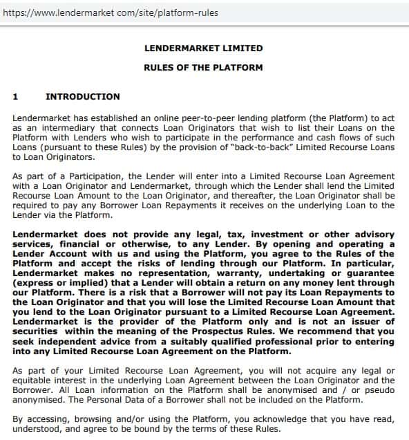 На официальном сайте инвестиционной компании LenderMarket Com имеется документ «Правила платформы», очень похожий на клиентское соглашение компании с ее пользователями, но он выполнен в формате pdf и только на английском языке, поэтому проанализировать и прочитать его в русскоязычной среде не представляется возможным.